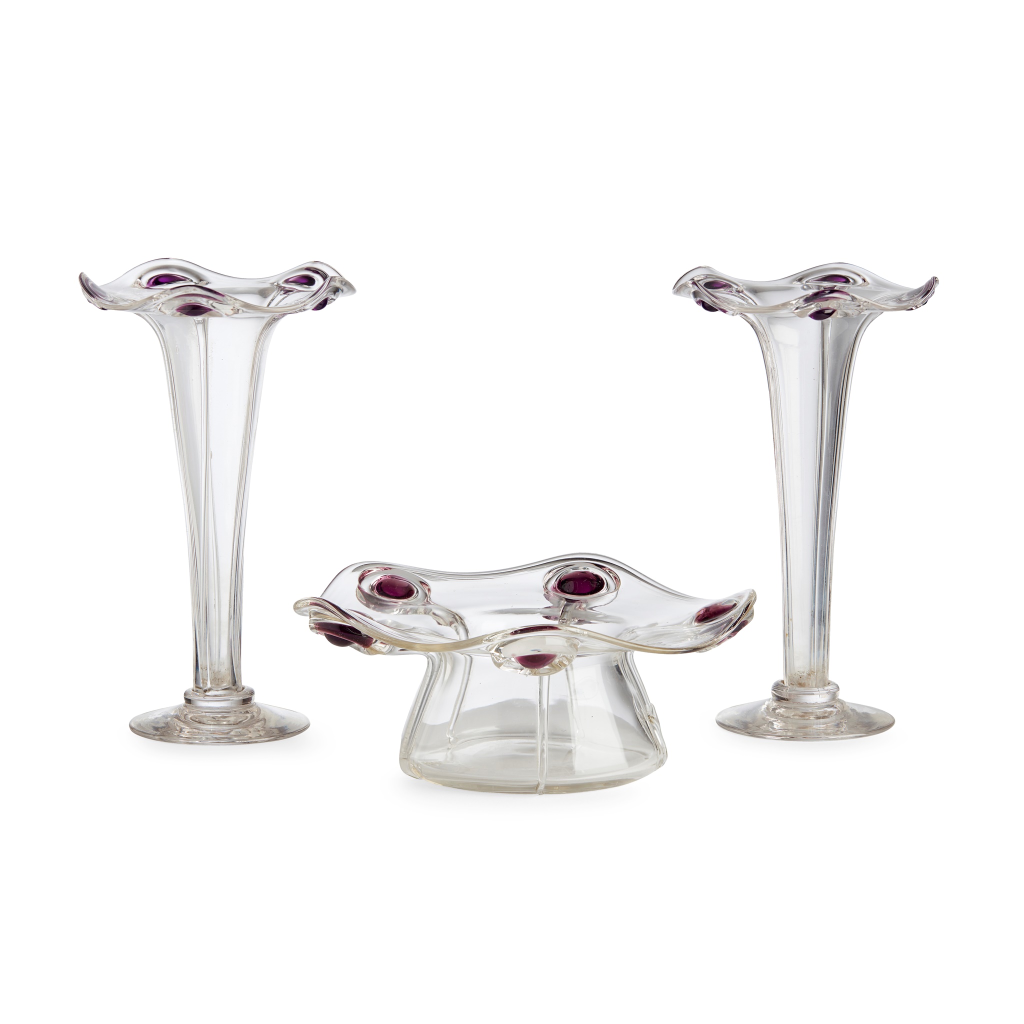 with wavy rims and applied amethyst and clear glass trails, 16cm high; together with a POSY VASE, of tapering form and similar decoration, 9cm high, each with applied amethyst trail decoration