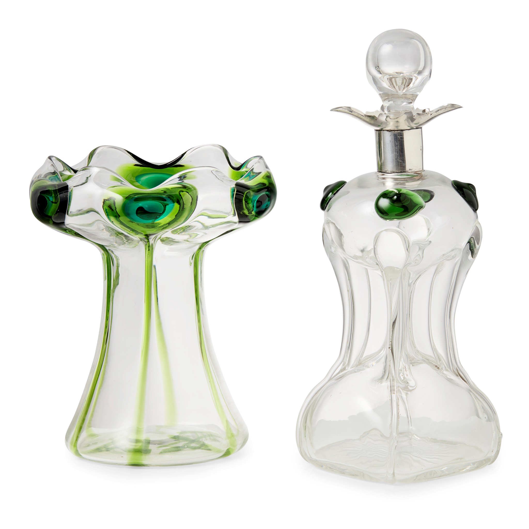 with applied trailing peacock decoration, 18.5cm high; together with a STUART SILVER MOUNTED GLASS DECANTER, the pinched body with applied green glass decoration, with glass stopper, stamped maker's marks WA and hallmarks for Birmingham 1904, 26.5cm high