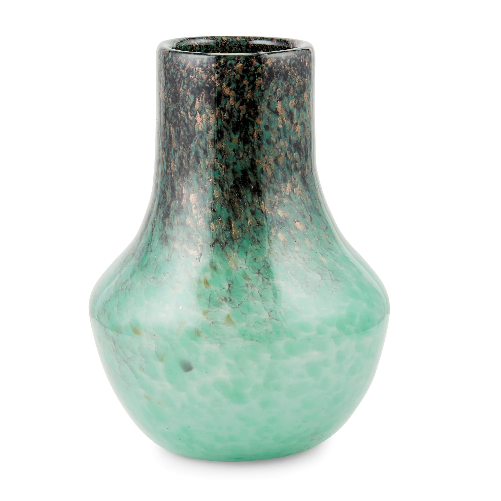 of baluster form, the mottled green glass body with amethyst and aventurine inclusions, with maker's label