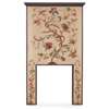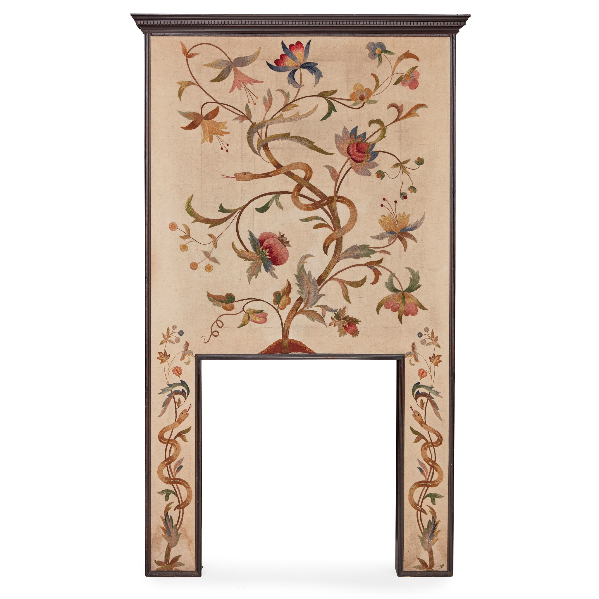 of rectangular outline with projecting dentil cornice and rectangular frame enclosing a crewelwork wool panel worked with flowering foliage on a cream ground and surrounding aperture for fireplace