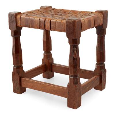 the rectangular latticed leather seat on faceted baluster turned legs linked by stretchers, carved mouse signature