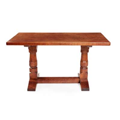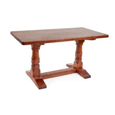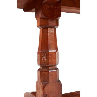 the rectangular top with adzed finish and exposed tenons, raised on faceted baluster supports, one with carved mouse signature, raised on trestle ends linked by a stretcher