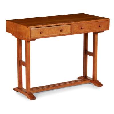 the rectangular top with two single drawers, raised on moulded supports linked by a stretcher