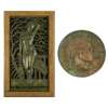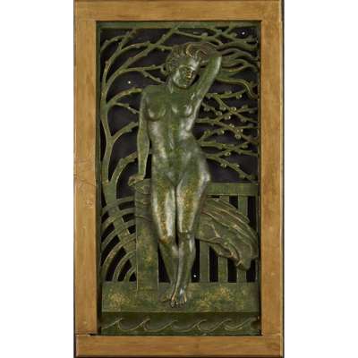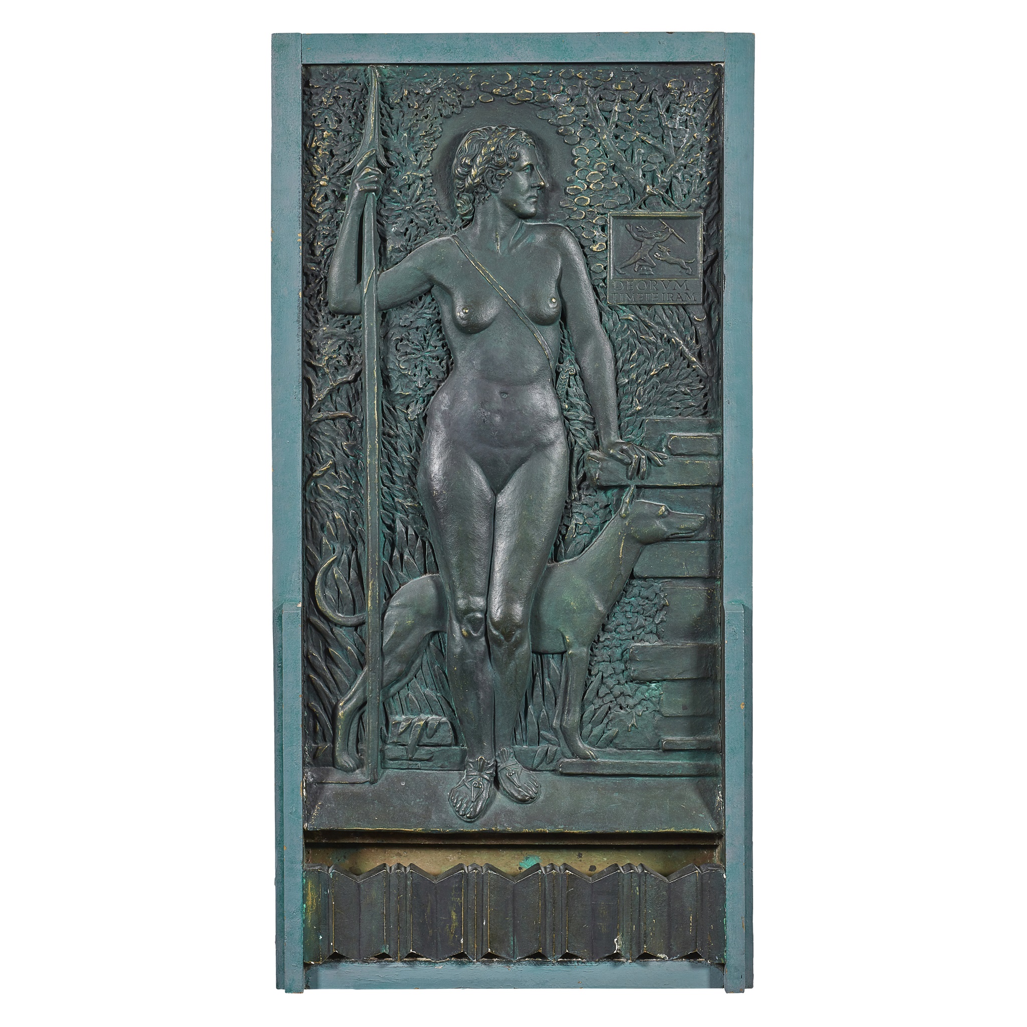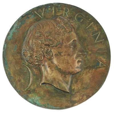 patinated plaster plaque, depicting a female figure in profile, modelled in relief, 69cm x 35cm; and 'DIANA', DESIGN FOR BRONZE FOUNTAIN, patinated plaster, bears cast inscription DEORUM TIMETEIRAM, and label verso 'DIANA', DESIGN FOR BRONZE FOUNTAIN/ CHARLES E. THOMAS ARBSA/ MANOR PARK NORTH/ EDGBASTON/ BIRMINGHAM, panel 94cm x 51cm, including frame 119cm x 59cm; and 'VIRGINIA', A ROUNDEL, bearing inscription VIRGINIA, 26cm diameter, unmarked