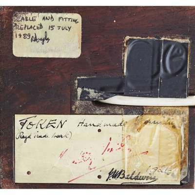 each with tall tapered columns on a moulded square base, one bears hand-written and printed maker's label TOKEN HANDMADE FURNITURE/ REGD. TRADE MARK/ BETTY JOEL/ J.W. BALDWIN/ 1926