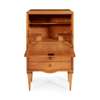 the plain fall opening to reveal a fitted interior above three drawers and square tapering legs with decorative brass capitals