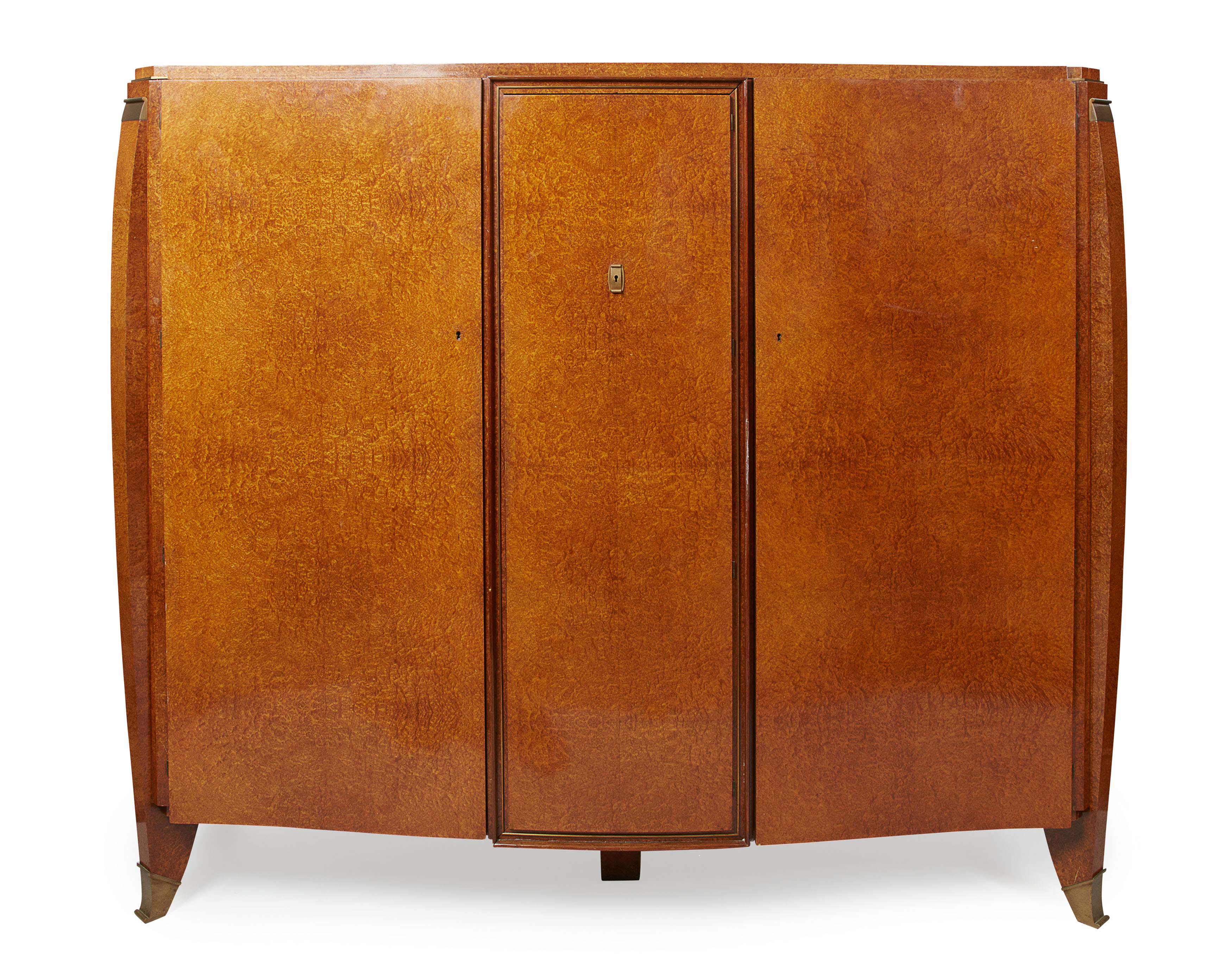 with three doors, enclosing a fully veneered and fitted interior of drawers and shelves, the angles embellished with shaped fins with brass cappings, the whole raised on brass capped outswept bracket feet