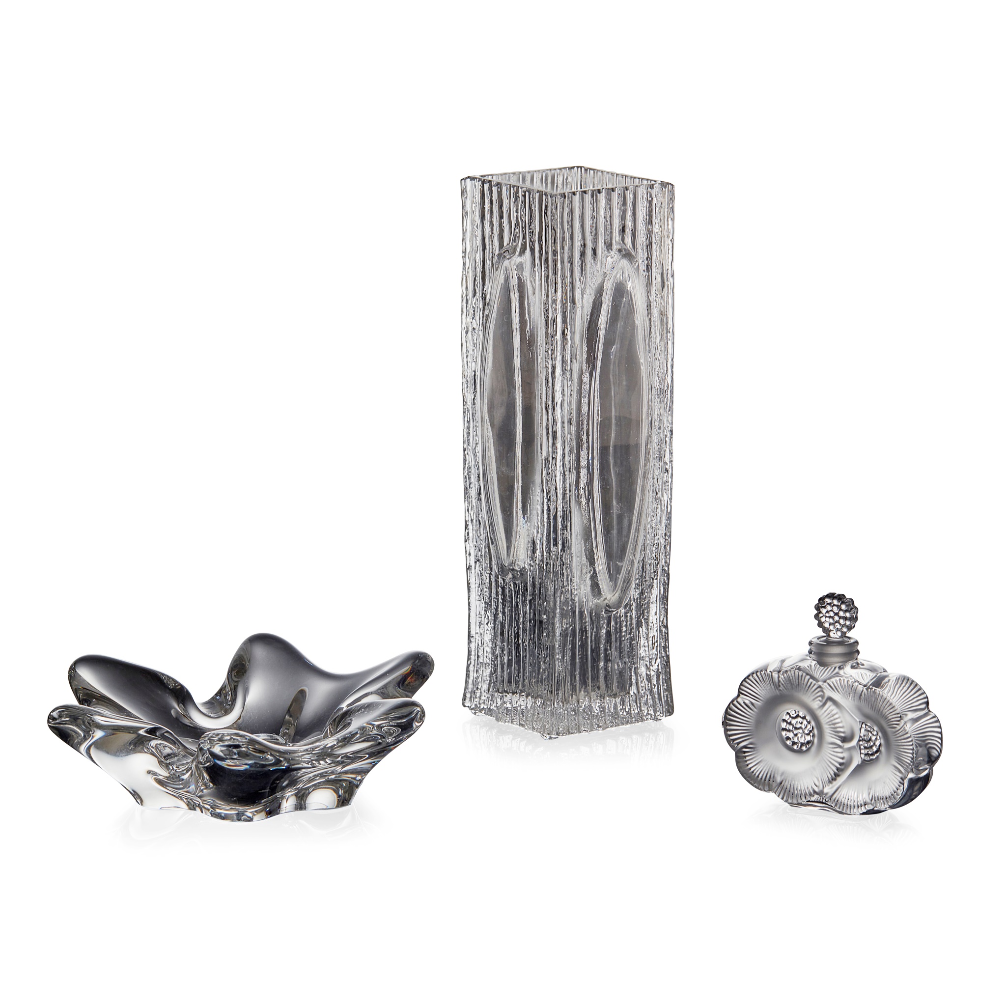 of squared form, the ribbed sides with clear oval panels, etched mark DAUM/ FRANCE, 24.5cm high; a SEVRES ASHTRAY, clear glass with six points, acid etched marks SEVRES/ FRANCE, 18cm wide; and a LALIQUE 'TWO FLEURS' FROSTED GLASS PERFUME BOTTLE AND STOPPER, formed of two flower heads, etched mark LALIQUE/ FRANCE, with maker's sticker and original box