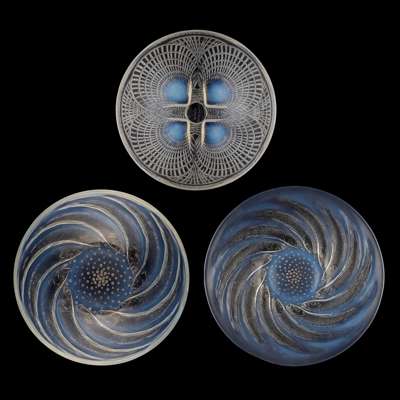 with spiralling sardines enclosing a bubbled centre, moulded marks R. LALIQUE, 31.5cm diameter; and a LALIQUE 'POISSONS' BOWL, moulded and wheel etched marks R. LALIQUE/ FRANCE/ NO. 3212, 20.5cm diameter; together with a LALIQUE 'COQUILLES' BOWL, introduced 1924, the underside moulded with four scallop shells, with etched maker's mark R. LALIQUE/ FRANCE/ NO. 3204, 13cm diameter