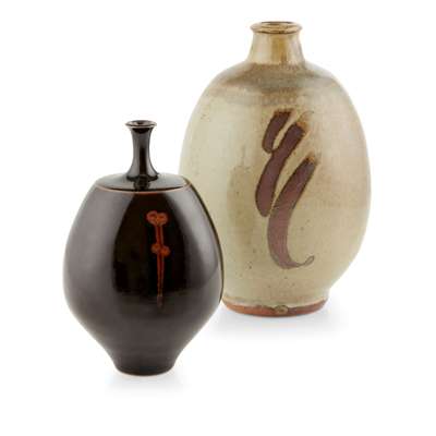 covered in a mottled glaze with brush stroke decoration, impressed artist's seal mark, 24.5cm high; and a DEREK CLARKSON VESSEL, covered in a tenmoku glaze, impressed artist's seal marks, 16cm high