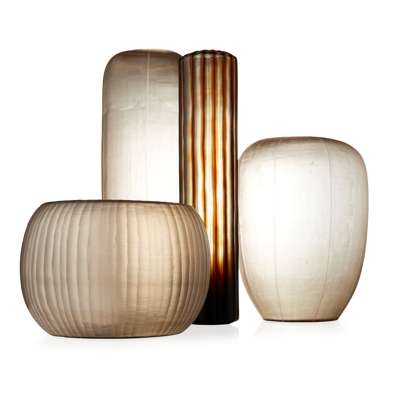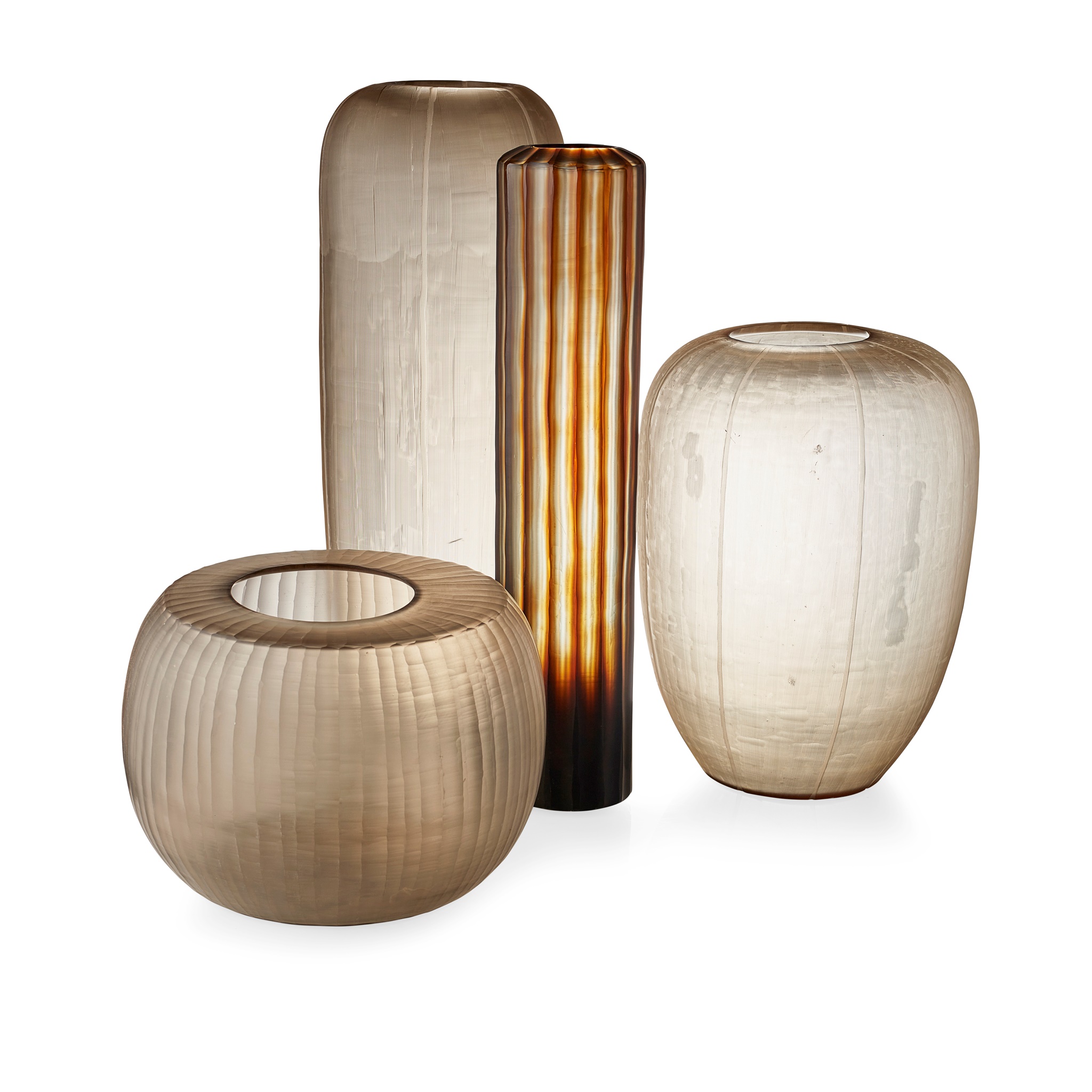 comprising a slender vase, with cut sides revealing orange ribs and terminating in a darkened base, marked MADE IN INDIA, 60cm high; a rounded example with flattened top, with textured hand-cut body, 25cm high; a further elongated vase, the ribbed body with unpolished bands, 64.5cm high; and a shouldered example, of the same decoration, 43cm high; all marked GUAXS