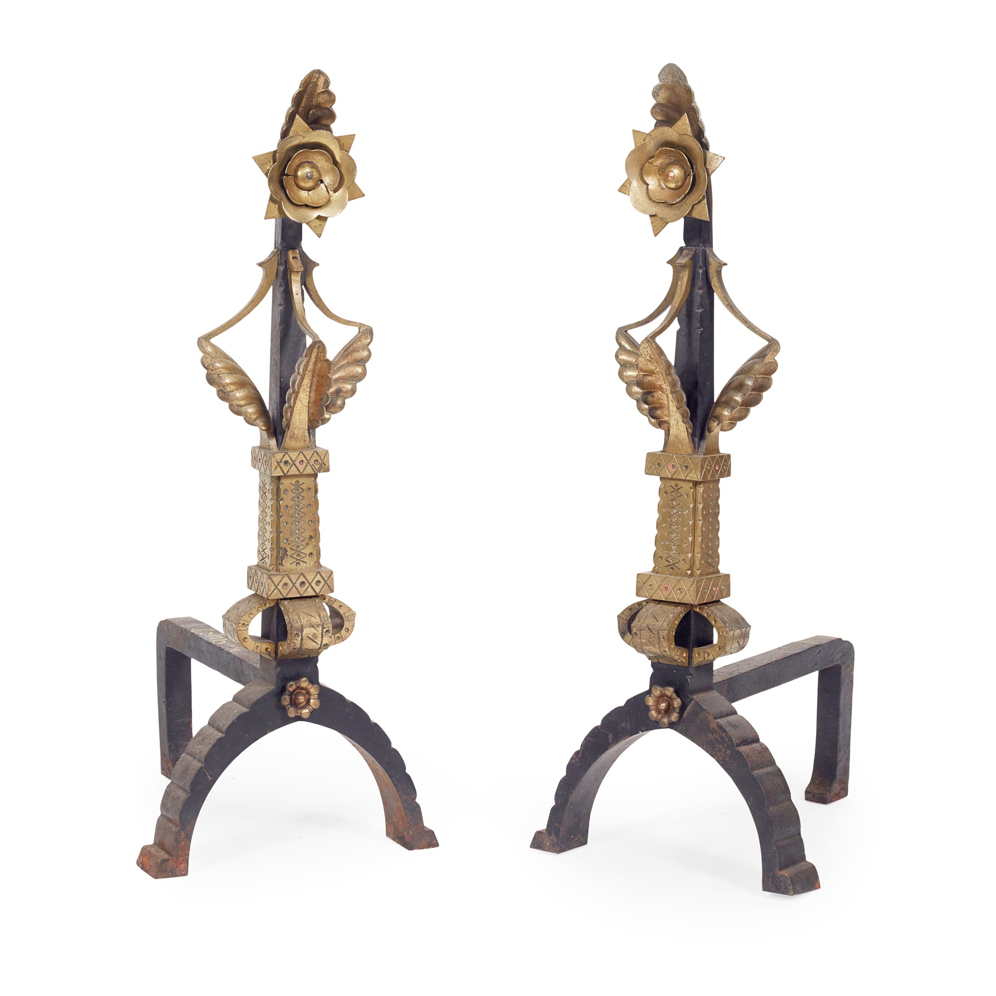 PAIR OF AESTHETIC MOVEMENT BRASS AND CAST IRON FIRE DOGS, CIRCA 1880