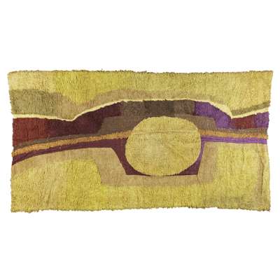 abstract forms in looped wools and mixed threads, reserved on a green ground