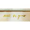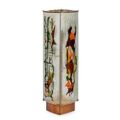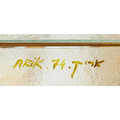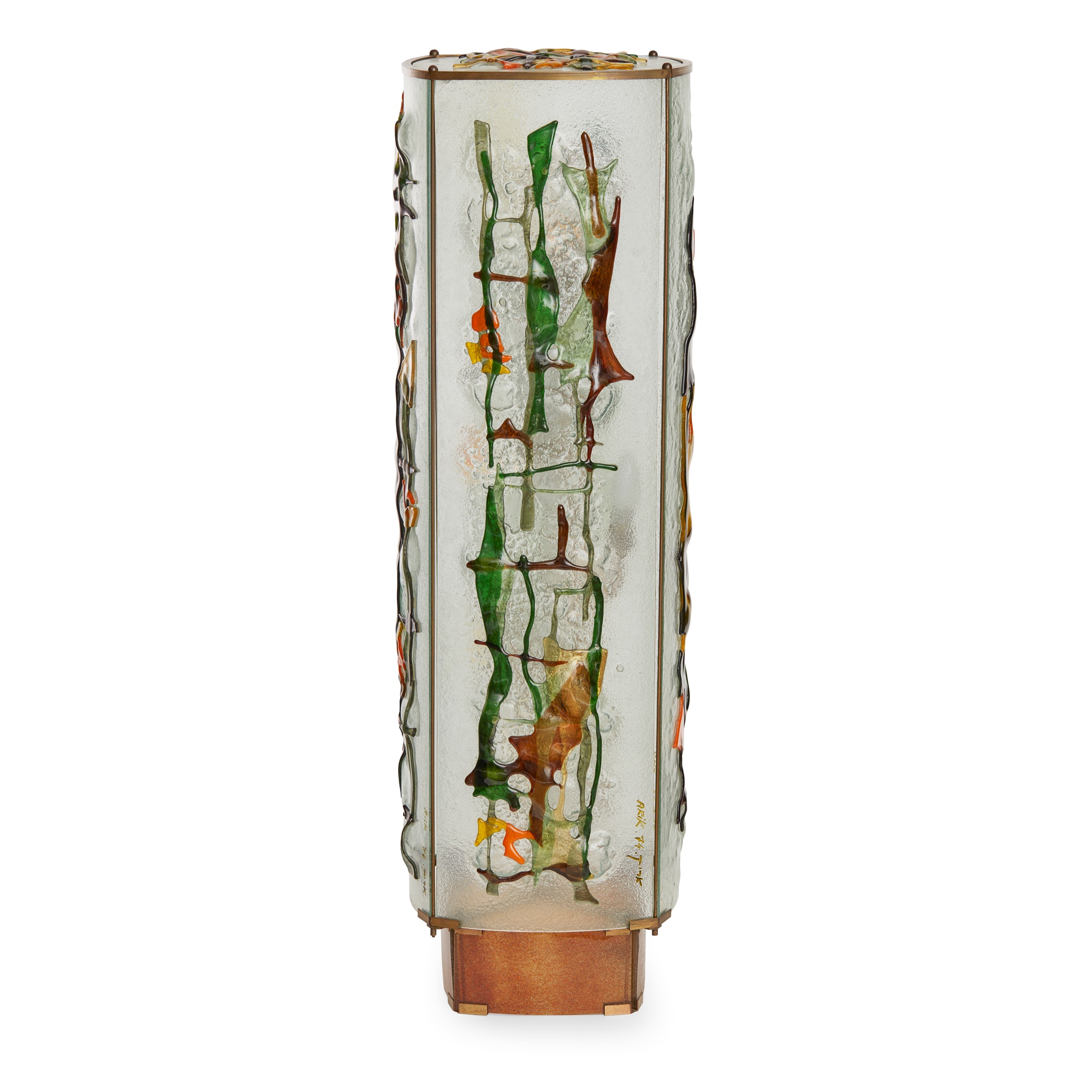 comprising four curved and frosted glass panels linked by brass supports, with applied abstract design in coloured glass, each panel signed ARIK/ 74/ T17K