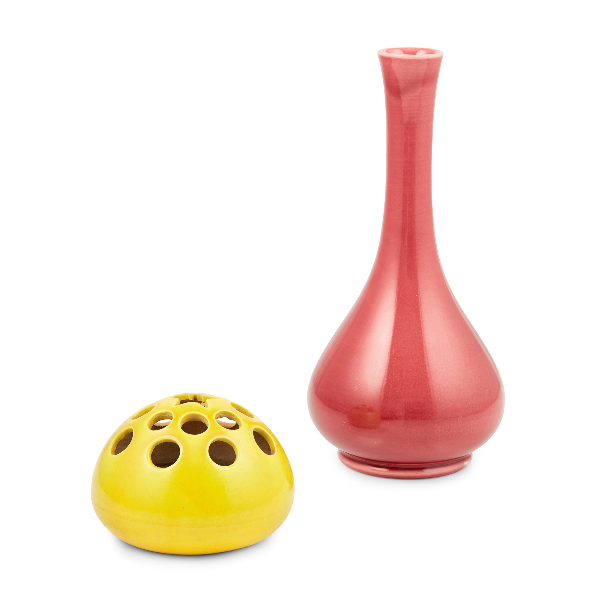 with yellow glaze, stamped facsimile signature under base and no. 238, 10cm across; and a WILLIAM AULT & CO. BOTTLE VASE, puce glaze, stamped makers marks to base WM. AULT/ ENGLAND, 23.5cm high