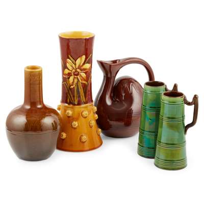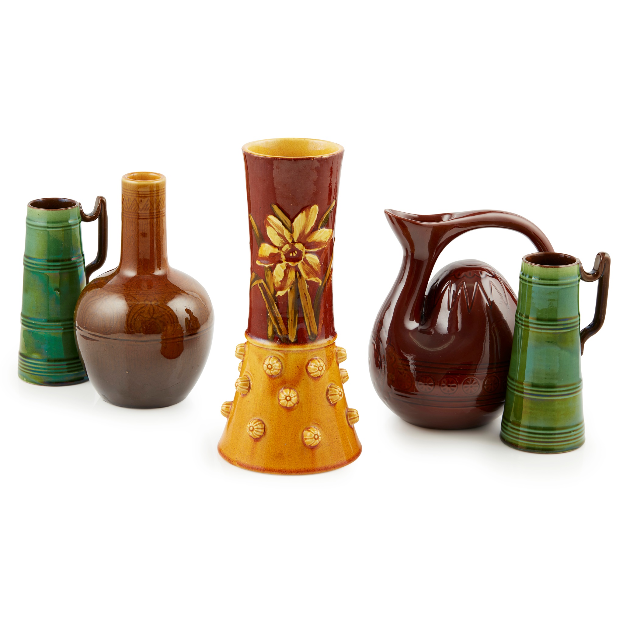 with incised decoration and covered in a brown glaze, impressed marks LINTHORPE/ 347 and impressed facsimile signature Chr. Dresser, 18cm high; and a FURTHER BOTTLE VASE BY THE SAME HAND, covered in an ochre glaze, impressed mark LINTHORPE, 18cm high; together with a POTTERY VASE, probably Linthorpe, but unmarked, ainted with daffodils and applied decoration, impressed and incised marks, 24.5cm high; and a PAIR OF TAPERING VASES, with moulded rib decoration and covered in a green glaze, 16cm high