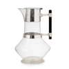 the clear glass body with cylindrical neck to lozenge shaped flared body and star cut base, the simple applied wide collar and short curved angular spout, the lower neck mount attached with straight stems to ebonised handle, with flat hinged cover, unmarked