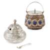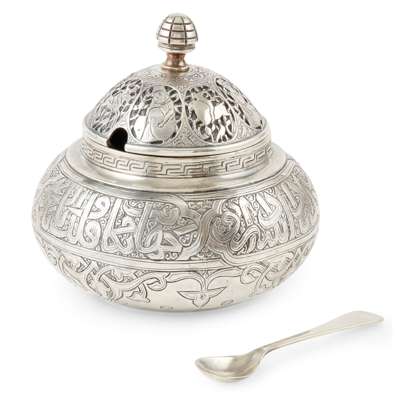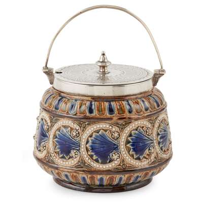 of bulbous form, decorated with Persian-style panels and decorative script, stamped maker's marks H&H 1831, 12cm high; and a DOULTON, LAMBETH AESTHETIC MOVEMENT SILVER MOUNTED PRESERVE JAR AND COVER, decorated with a frieze of ornate stylised foliate design, incised and impressed maker's marks, the silver mounted cover and handle with maker's marks for Hukin & Heath, Birmingham hallmarks, 13cm high (handle up)