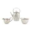 bark finish, comprising a TEA POT, 18cm high; a SUGAR BOWL, 11cm diameter; and a CREAMER, 14cm across, each with stamped maker's marks, the teapot stamped RD. NO. 137119