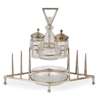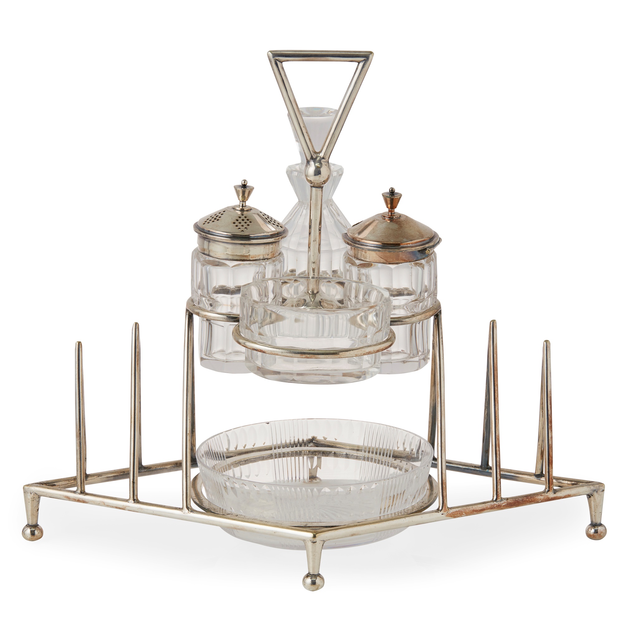 of triangular form, with central holders containing a glass bowl, salt, pepper, mustard pot and bottle decanter, flanked by angled dividers, stamped maker's marks H&H/ 2150