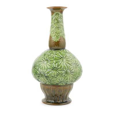 of bottle form, moulded with an allover daisy design in relief, applied maker's mark/ 46, 32cm high; and a BULB-SHAPED BOTTLE VASE FOR WILLIAM AULT & CO., the waved rim above a slender banded neck, terminating in a bulbous body, in brown and white marbled glazes, impressed facsimile signature Ch. Dresser/ 323, 22.5cm high
