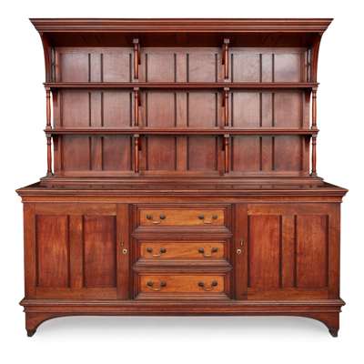 the superstructure with sloping moulding cornice above three tiered plate stands with column supports, the base with three central drawers flanked by panelled doors above carved apron, above stile supports
