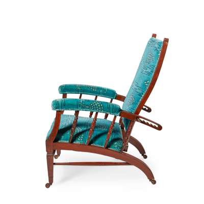 with mahogany frame, the adjustable back and seat with later Liberty's velvet upholstery