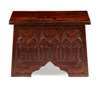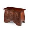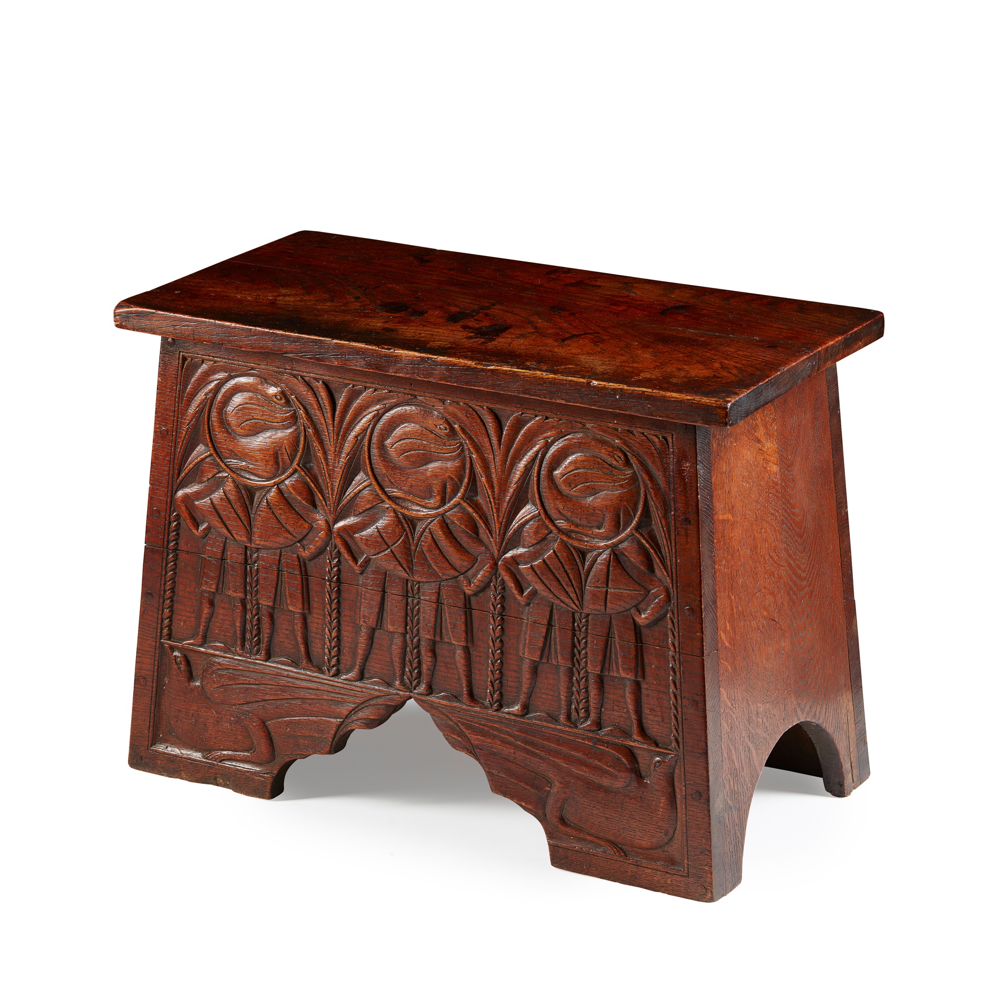 elm, with hinged lid, decorated to the front with a frieze carved with birds and opposed figures