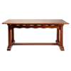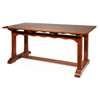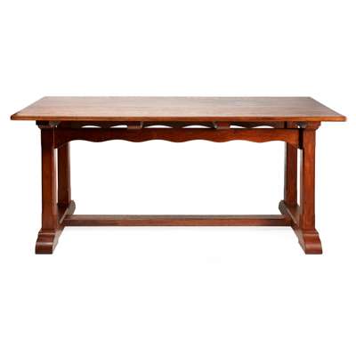 the rectangular top above a waved stretcher and raised on square chamfered legs on trestle ends linked by a stretcher