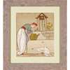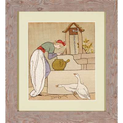 worked in coloured threads and silks, depicting a woman collecting water by a well, later framed and mounted