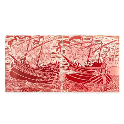 PAIR OF RUBY LUSTRE 8 INCH TILES, CIRCA 1890