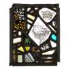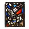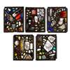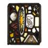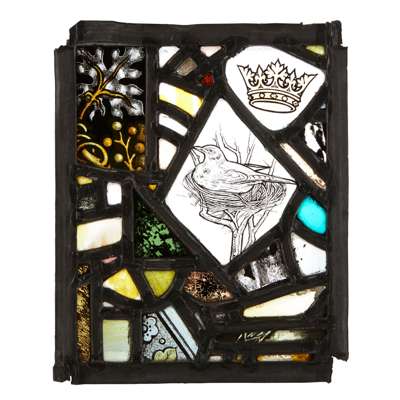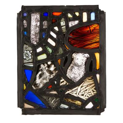 each panel of stained, painted and leaded glass in a collage design