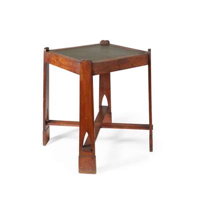 the square top with inset writing surface on pierced plank supports linked by cross-stretchers