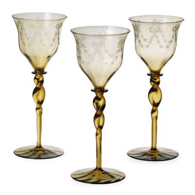 the bowls with applied pulled prunts on spirally twisted stems, 18cm high; together with THREE WHITEFRIARS OLIVE DRINKING GLASSES ATTRIBUTED TO HARRY POWELL, each of tapering trumpet form, engraved with ribbon and floral swags, with rope twist stem, raised on a spreading circular foot, 19cm high