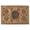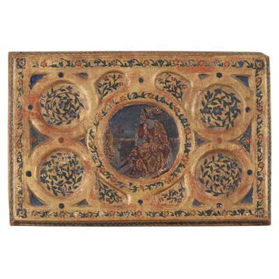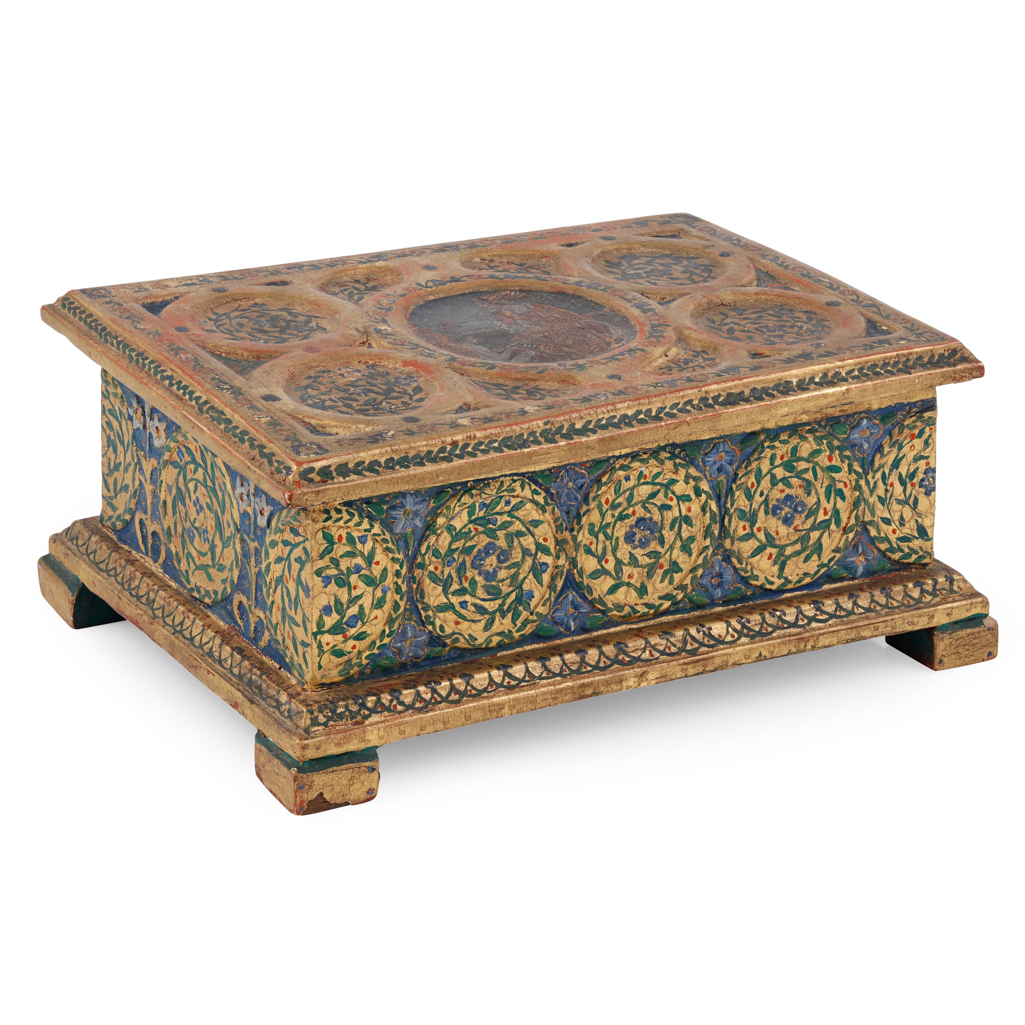 polychrome painted wood, of rectangular form carved in low relief, painted in blue, red, green and gilt, the painted roundels depicting flowers with a central image of a maiden and angel, opening to a silk-lined interior