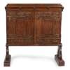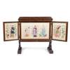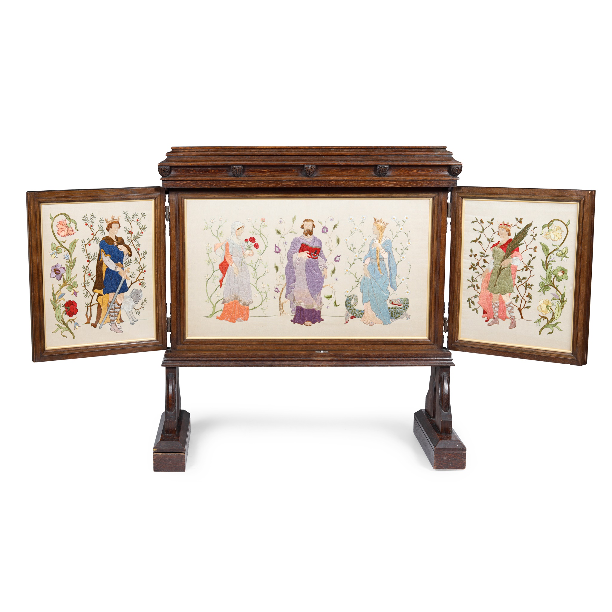the moulded top with carved leaf bosses, bearing each with letter E/ J/ R/ M/ O/ M/C/C/R/L/C above twin panelled doors with elaborate brass hinges, opening to reveal three embroidered panels, each worked in coloured silks and gold threads on a silk ground, depicting medieval figures, inscribed EMBROIDERY DONE BY MARJORIE COX FROM JUNE 1910 TO OCTOBER 1911, the whole raised on curved bracket supports