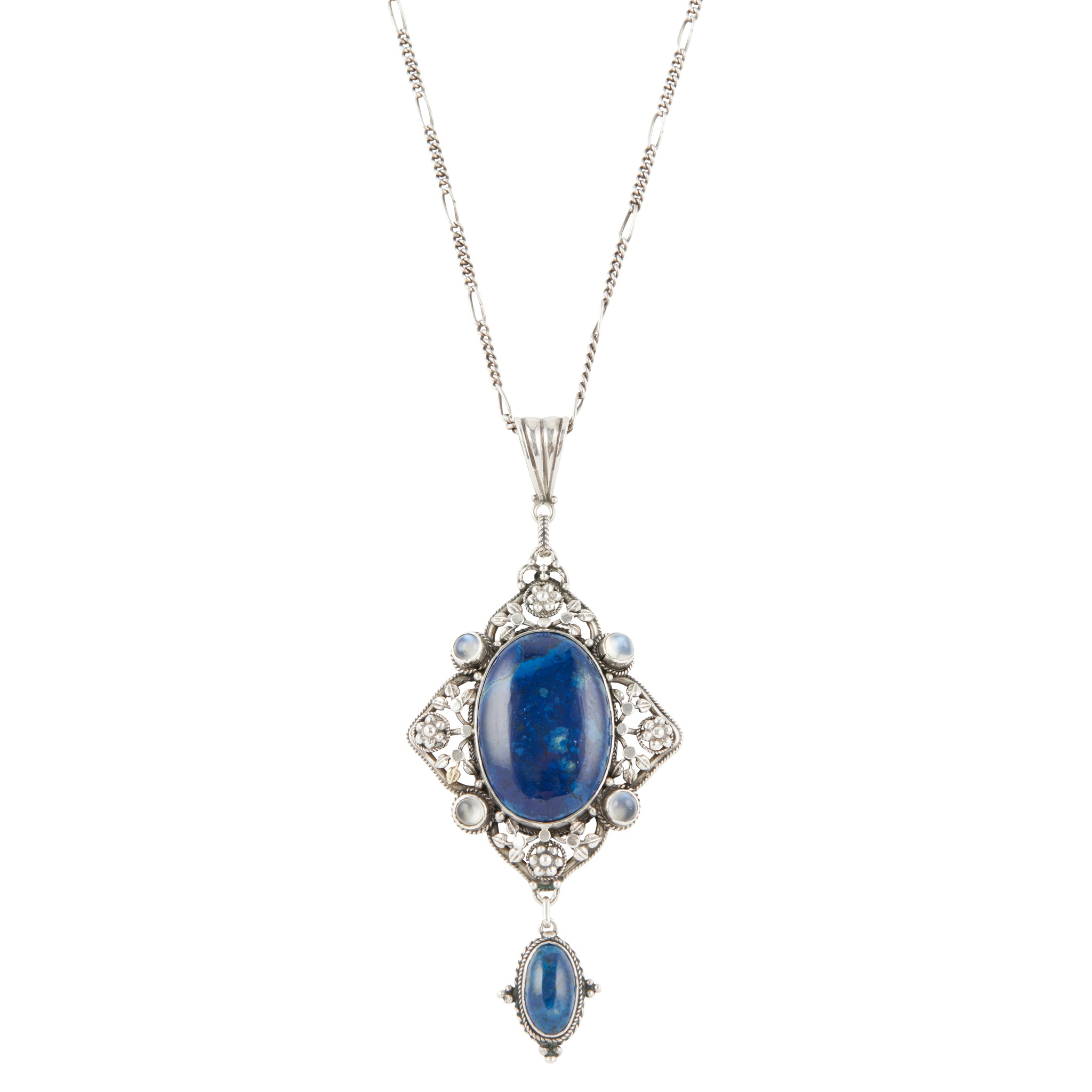 the central blue hardstone cabochon enclosed by floral openwork and set with four moonstone cabochons, with blue stone drop, fine links chain with spacers