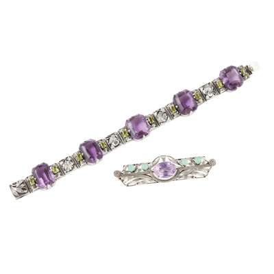 the six amethyst coloured stones flanked by peridots and cast foliate panels, the locking clasp stamped SILVER, 19.5cm long; together with a WHITE METAL AND GEM SET BAR BROOCH, the central amethyst flanked by two green cabochons to each side, within rope twist and leafy openwork, 7cm long