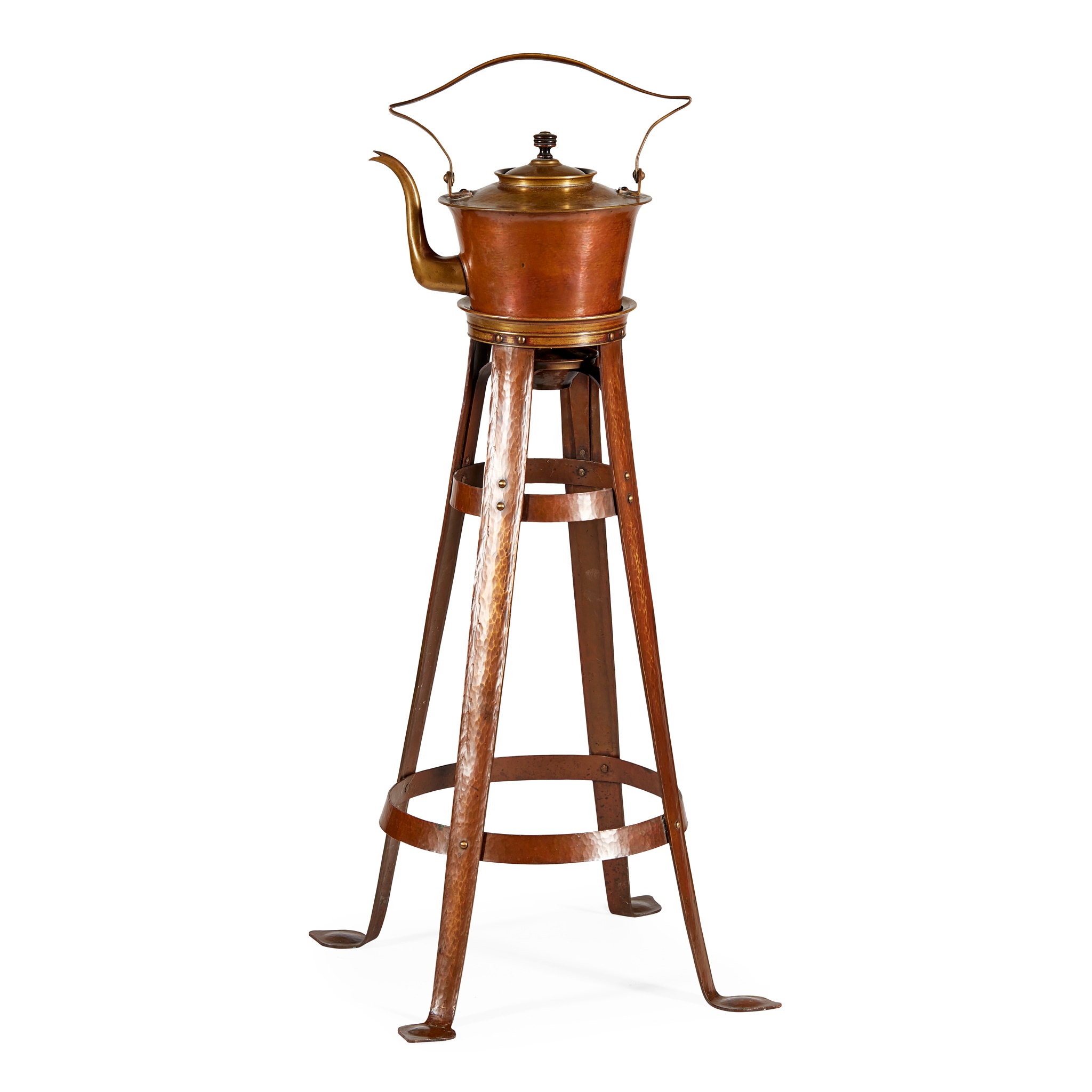 stamped to base of kettle BGH, total height 86cm; together with a CHRISTOPHER DRESSER SPIRIT KETTLE ON STAND BY BENHAM AND FROUD, brass and copper kettle on wrought iron stand, stamped marks to base and registration no. B163269, total height 79cm