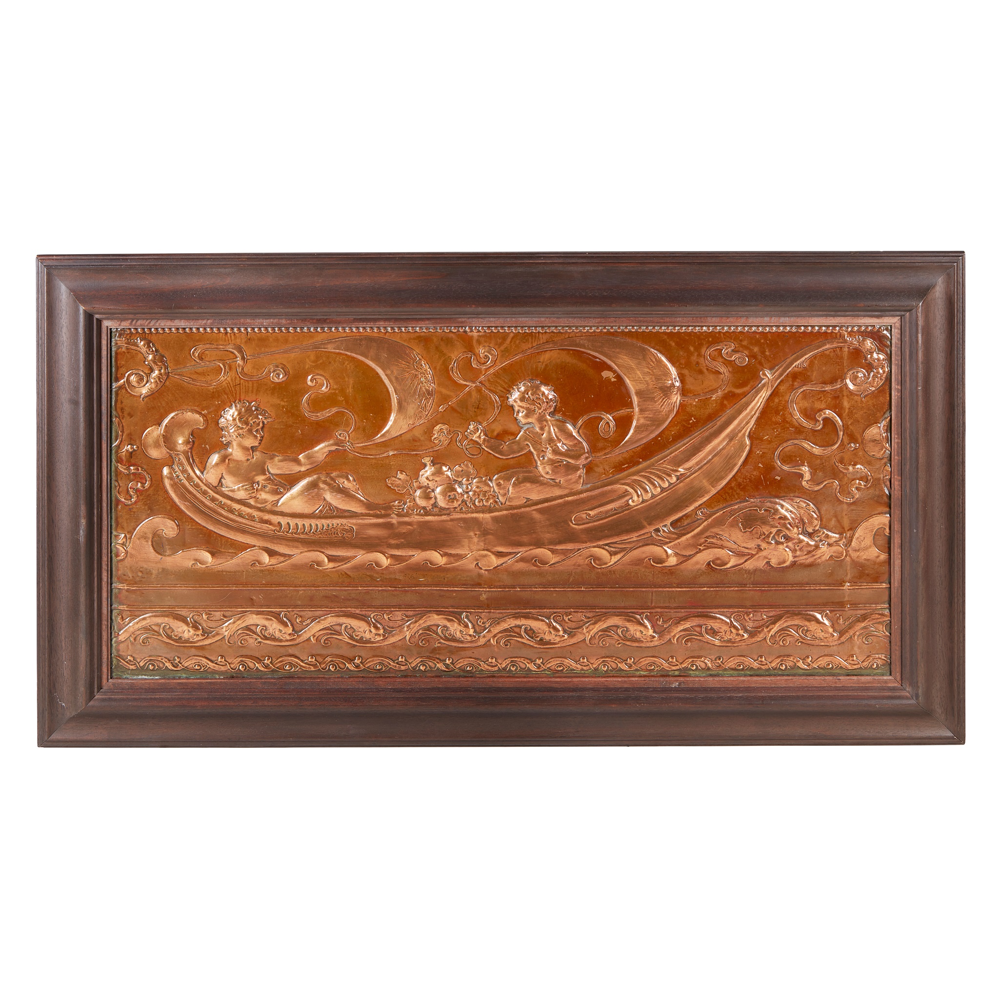 copper, embossed with a relief scene of putti in a sailing ship, later framed