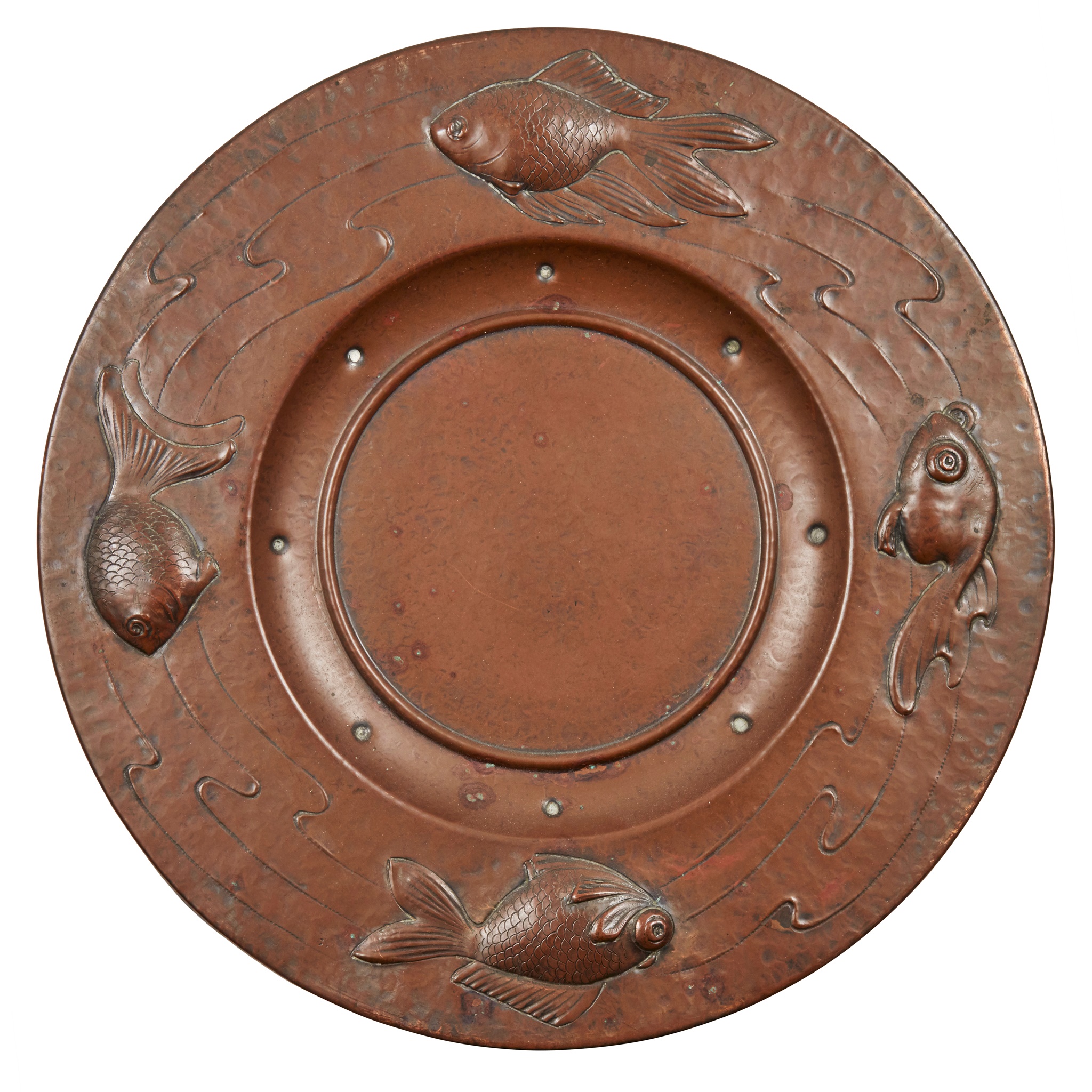 patinated copper, repoussé-decorated with a stylised plant form, 29.5cm high ; together with an ARTS & CRAFTS COPPER CHARGER, possibly J & F Pool, Hayle, decorated with swimming fish, 41cm diameter