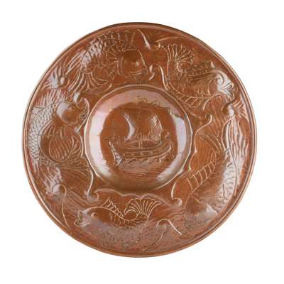 repoussé-decorated with a galleon in full sail, enclosed by a band of swimming fish