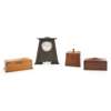 with enamelled dial and tapered case, with winding key, 24cm high; an ARTS & CRAFTS INLAID TEA CADDY & COVER by ARTHUR W. SIMPSON, KENDAL, 14cm high; a COTSWOLD SCHOOL OAK BOX, with fitted interior, 19.5cm across; and a MAHOGANY TRINKET BOX, 16cm wide
