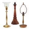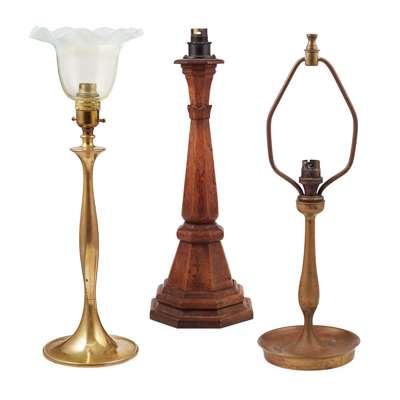 the frilled opaline shade supported on a baluster turned column with spreading base, total height 46cm; a SIMILAR EXAMPLE, with dished base and shade support, 45.5cm high; and an ARTS & CRAFTS OAK LAMP BASE, of faceted tapering form, 41cm high to fitting