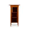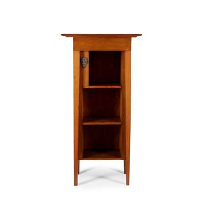 the projecting cornice above open shelves with applied university crest, on square tapered legs