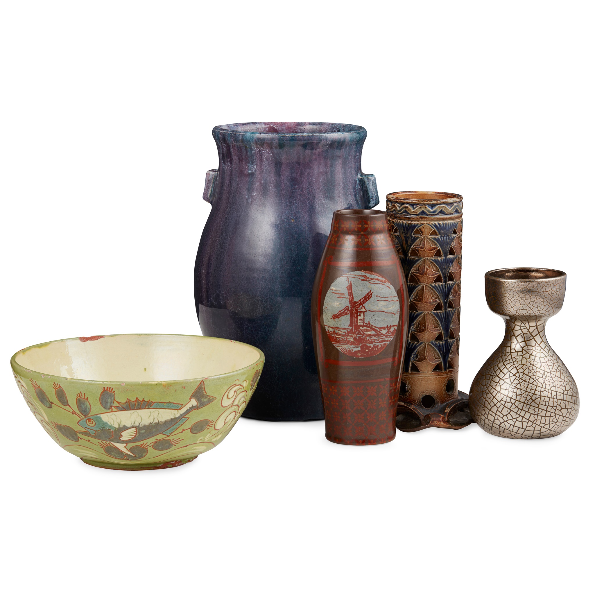 comprising a COLDRUM VASE. designed by Reginald Wells, circa 1914, with applied lugs, stamped maker's marks, 26.5cm high; an ELTON VASE, with silvered craquelure glaze, painted maker's mark ELTON, 14cm high; a MINTON VASE, printed and painted with Dutch scenes, impressed maker's mark, painted make B, 20cm high; a SALT-GLAZED SLEEVE VASE, PROBABLY FULHAM POTTERY, unmarked, 21cm high; and a H. BRANNAM BOWL, decorated with fish, incised maker's marks, dated 1891, 21cm diameter