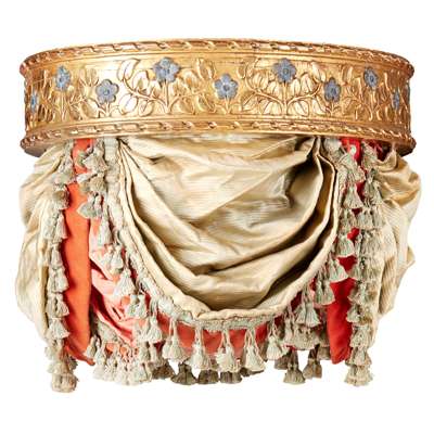 of oval form carved with a polychrome painted frieze of flowering foliage, with tasselled silk hangings