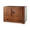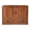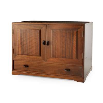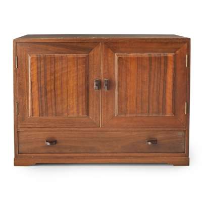 the twin cupboard doors above a long drawer, the whole raised on a plinth base with shaped bracket feet
