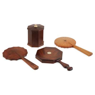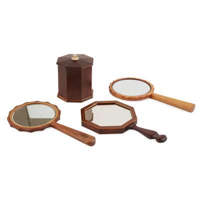 of octagonal outline with ivory finial, 12.5cm high; also TWO WALNUT HAND MIRRORS ATTRIBUTED TO HUGH BIRKETT, one with line inlay, each 25.5cm long; and an INLAID HAND MIRROR BY AUGUSTUS MASON, CIRCA 1913, stamped maker's marks to interior H MASON AUGUSTUS 1904, 23.5cm long