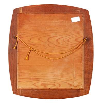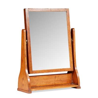 with exposed tenons, 39cm x 43cm; together with an ARTS & CRAFTS OAK TOILET MIRROR, branded stamp to base AM, with a Crown, 38.5cm wide, 55.5cm high